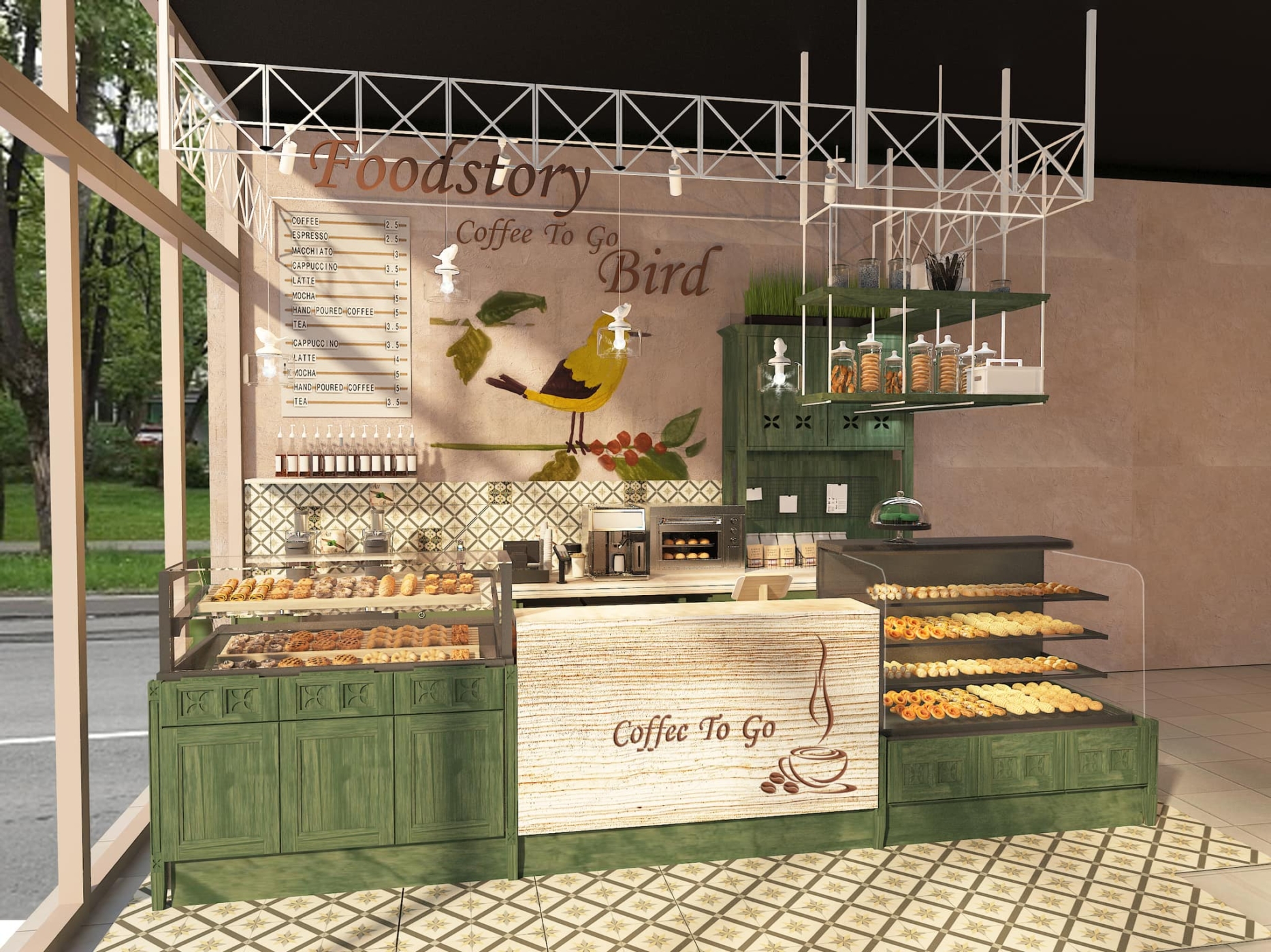 Оборудование: профессиональная кофемашина, кофемолка, холодильники, витрины, печь и гриль