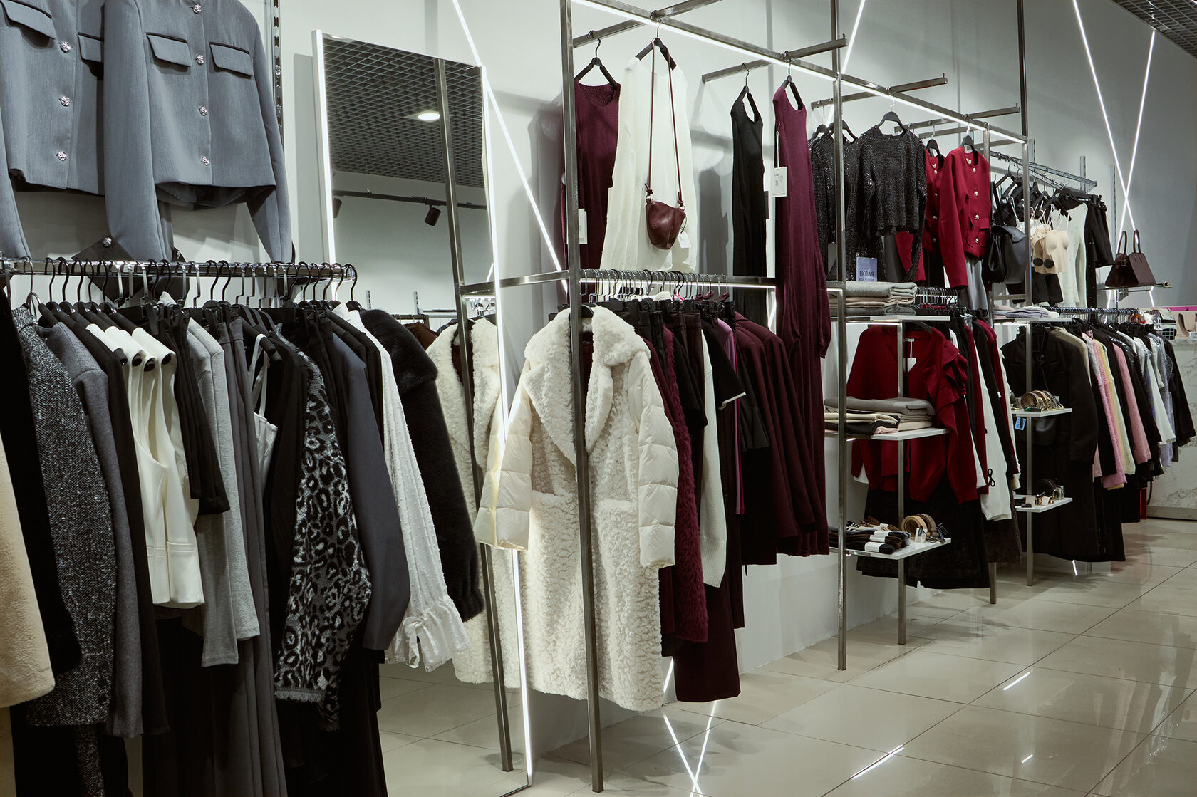Полностью оборудованный магазин с постоянным потоком клиентов. Стиль одежды — современный деловой, офисный, для торжеств. Размерный ряд от 42 до 60 охватывает широкую аудиторию.